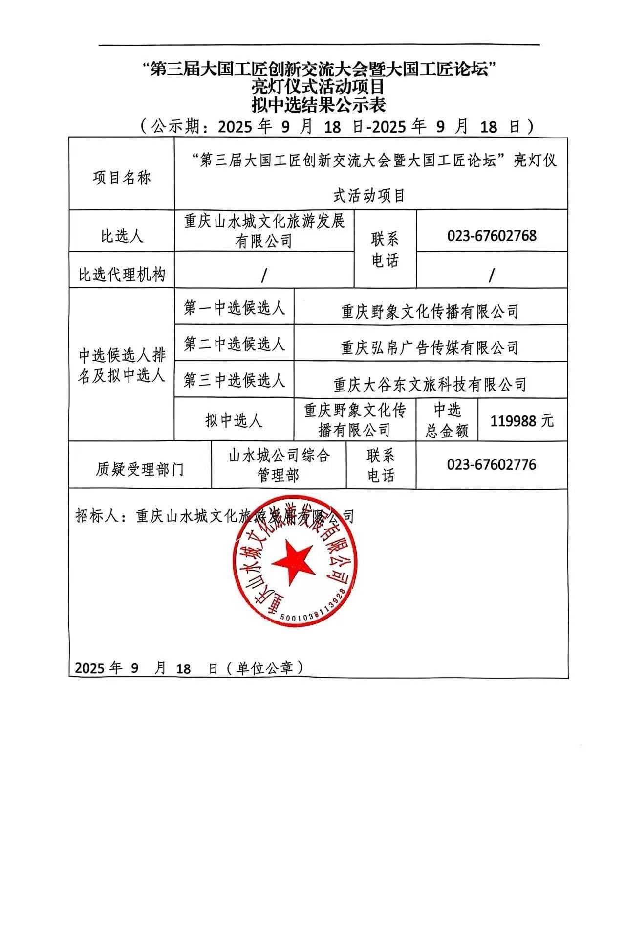 “第三届大国工匠创新交流大会暨大国工匠论坛”亮灯仪式活动项目拟中选结果公示表